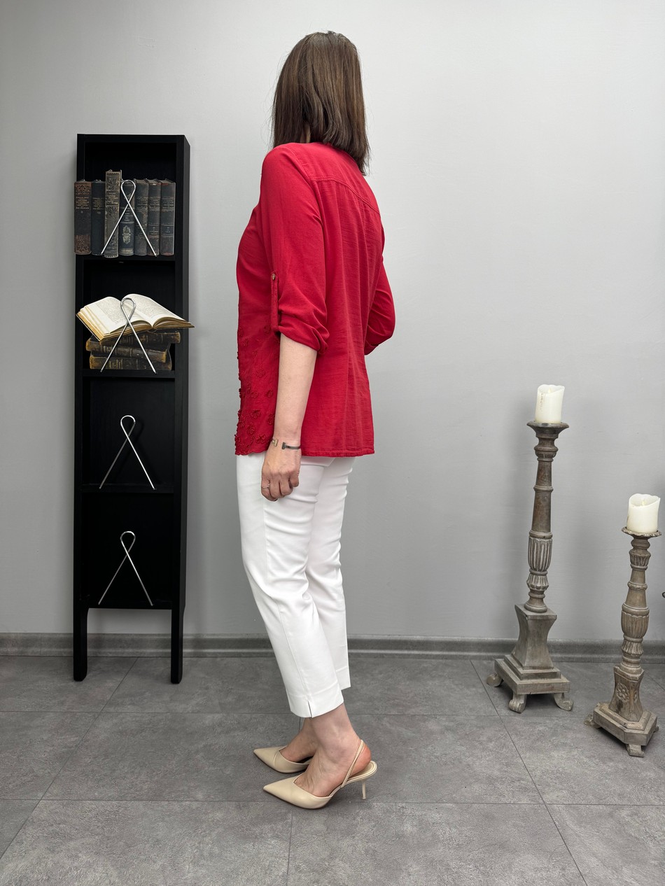 42-48 beden aralığında bedenli, kolları kıvırmalı kabartma nakışlı pamuklu gömlek...