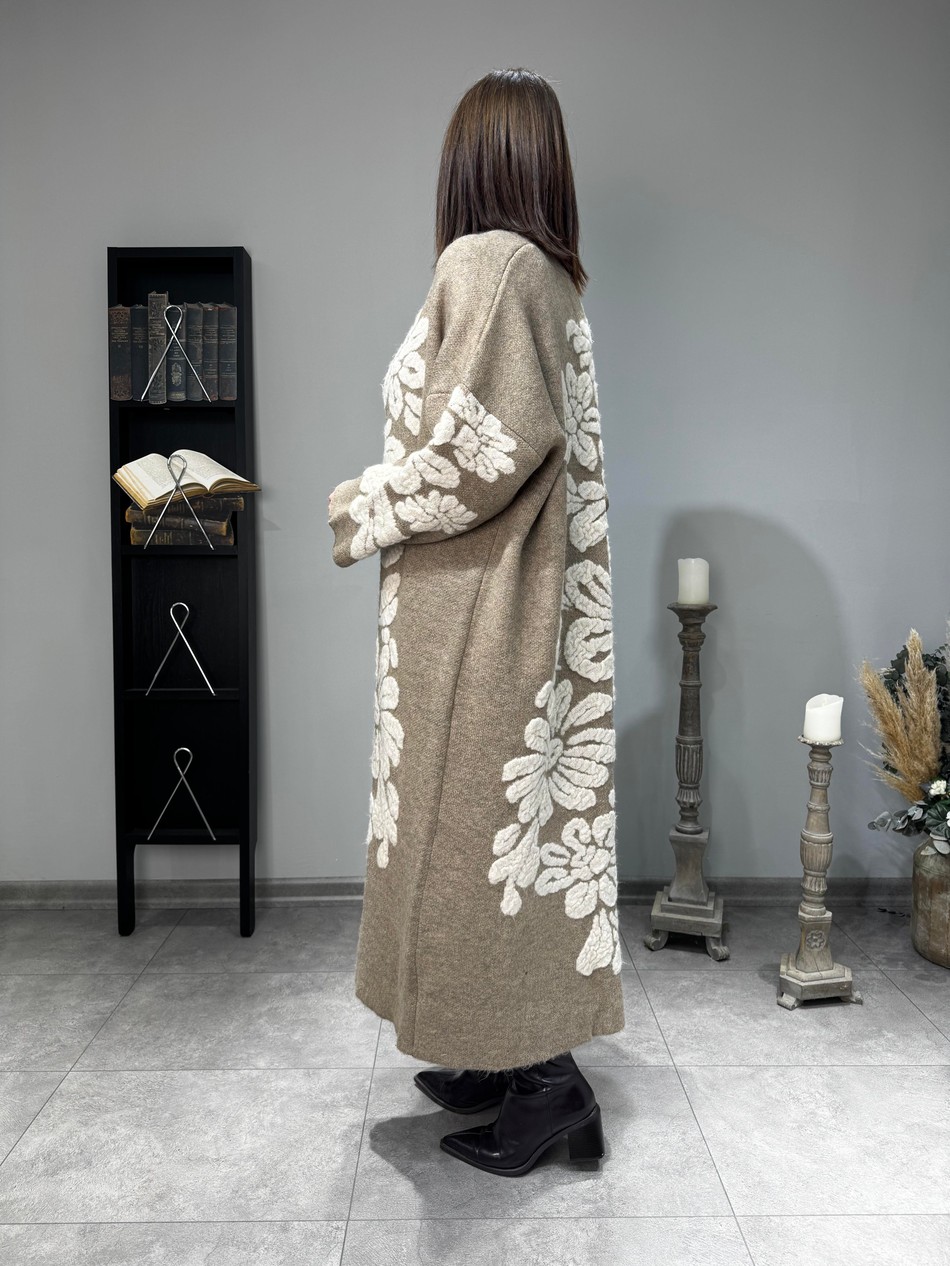 Üzeri Kabartma Nakışlı Uzun Triko Hırka
